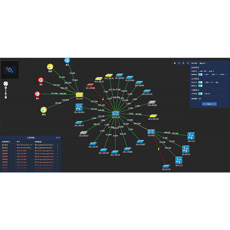 系统支持自动发现设备的物理连接关系,并且也支持手动建立连接关系,支持拓扑设备自动合理布局。拓扑中实时显示设备的状态和链路流量等信息,支持告警信息的实时展现提醒,支持上传拓扑背景图片,用户可以根据自己的需要自定义属于自己的拓扑展现。
