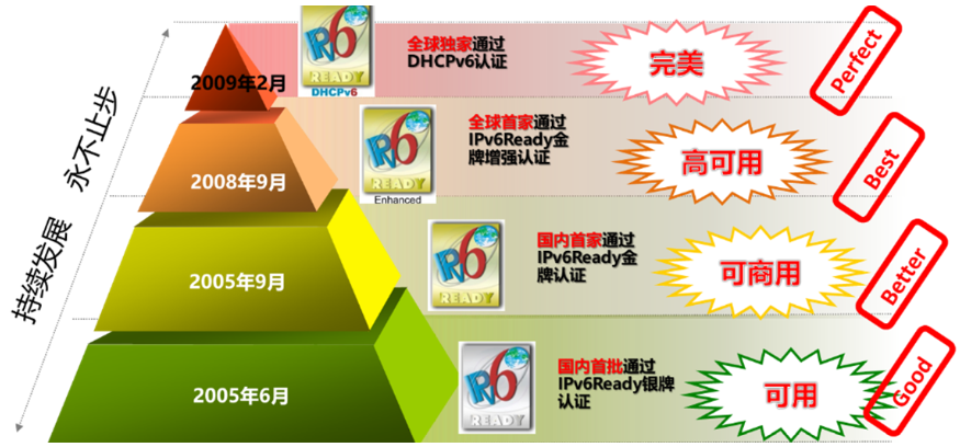 巅峰国际是国内首个顺利获得IPv6 Ready Phase2 认证的网络厂商,也是全球首个顺利获得IPv6 Ready Phase2 Enhance认证的网络厂商,还是全球最早顺利获得DHCPv6认证的网络厂商。